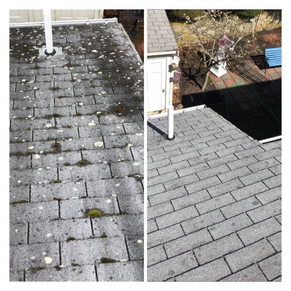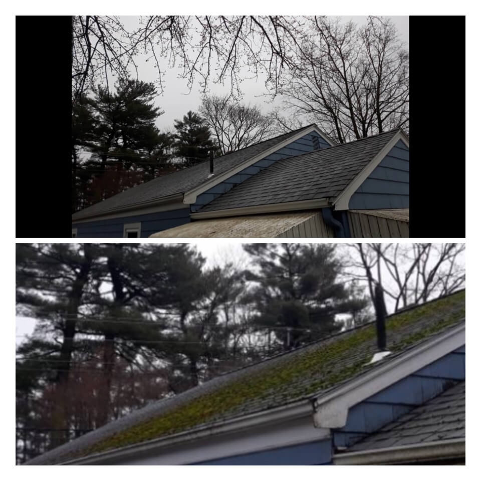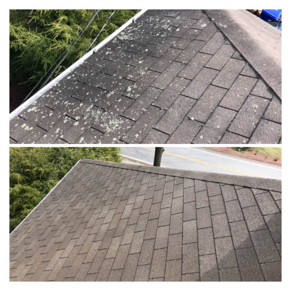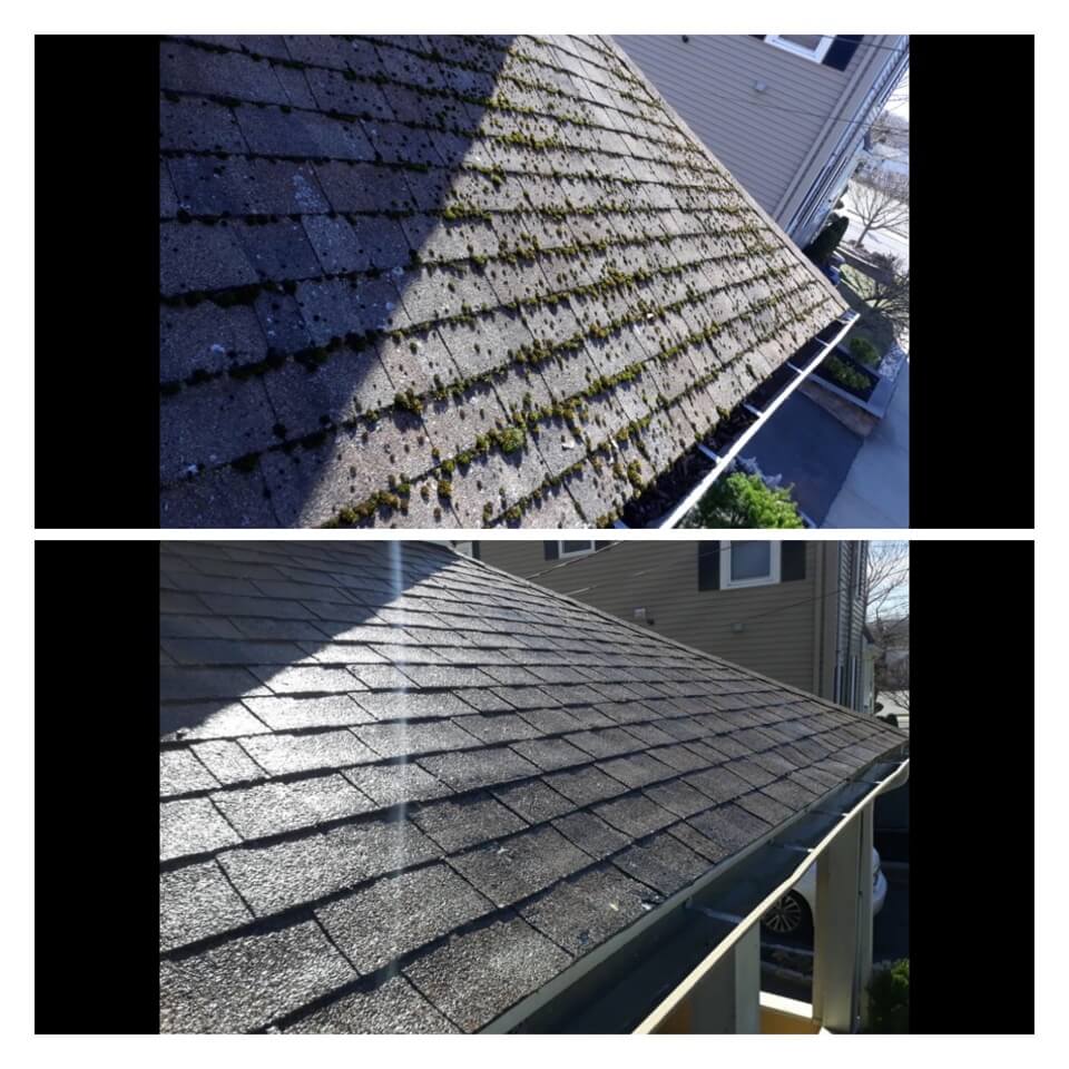 HiCleaners is the most experienced company in Nashua, NH that deals with roof washing and roof soft washing. All of our employees are trained to recognize precise solution mixing ratios to provide you with the safest and most effective soft washing service. Roofs are a commonly neglected part of a house due to the fact that most people don’t have ladders to access it, so it is very easy to just leave it alone and forget about problems that may start to arise. Just like many home owners, discoloration and small bits of moss on a roof can be overlooked because of the misconception that it is just aesthetic. However, it isn’t just aesthetic, the moss slowly lifts the granules off the shingles which in turn shorten the life of the shingle. The moss also spreads, just like any bacteria if it is left alone for too long, it can quickly become a problem that spirals out of control. Call HiCleaners for a free quote, we only use the most advanced eco-friendly solutions and equipment to make sure the job is done right, for the safety of the employees, your plants, grass, pets, and children.